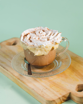 Café moka, leite vaporizado, cacau, canela, Chantilly e creme de ninho.
