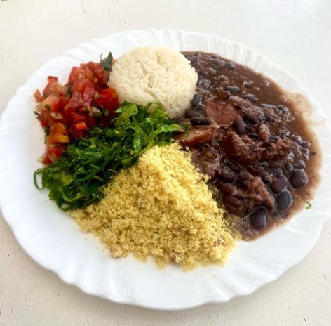Feijão preto, linguiça defumada, carne de porco, carne seca, farofa, couve refogado e vinagrete.